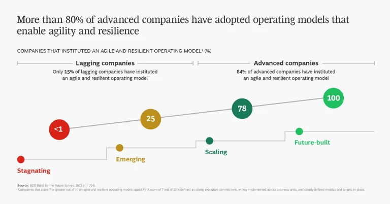 The benefits of an agile and resilient operating model include recovery from crises more than two times faster than that of stagnating companies. (See exhibit.)
