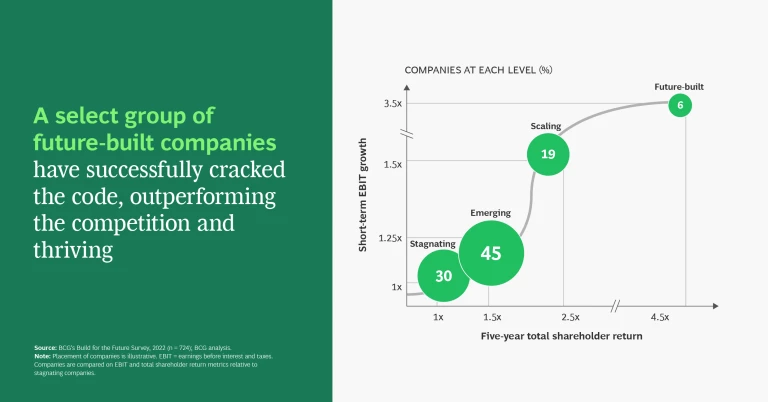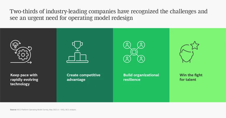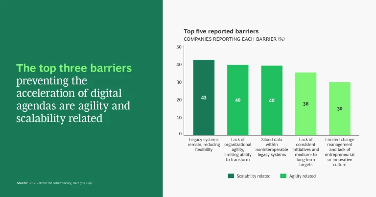 To succeed in today’s demanding business environment, companies need an agile and resilient operating model—one that supports their digital initiatives, eliminates duplication, bolsters results, and allows them to recover quickly from a crisis. Yet, BCG’s new Build for the Future (BFF) survey finds that legacy incumbents are typically struggling with siloed data, noninteroperable IT systems, and legacy infrastructure. They lack frontline decision-making ability. And they are resistant to change. These and other challenges block the path to success.