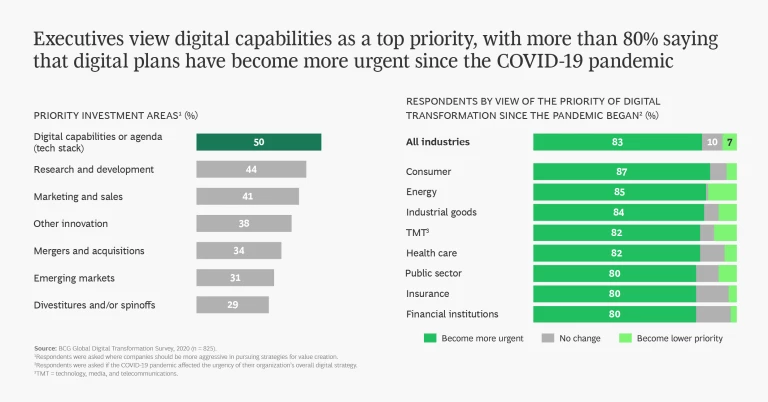 Perhaps unsurprisingly, executives in a separate survey point to digital capabilities as the top transformation priority. And many businesses have already deployed numerous—and often duplicate—small-scale digital initiatives. Others have implemented large-scale and effective projects, but the resulting capabilities are underused. Our BFF survey reveals how leading companies have succeeded. (See “Build for the Future”.)
