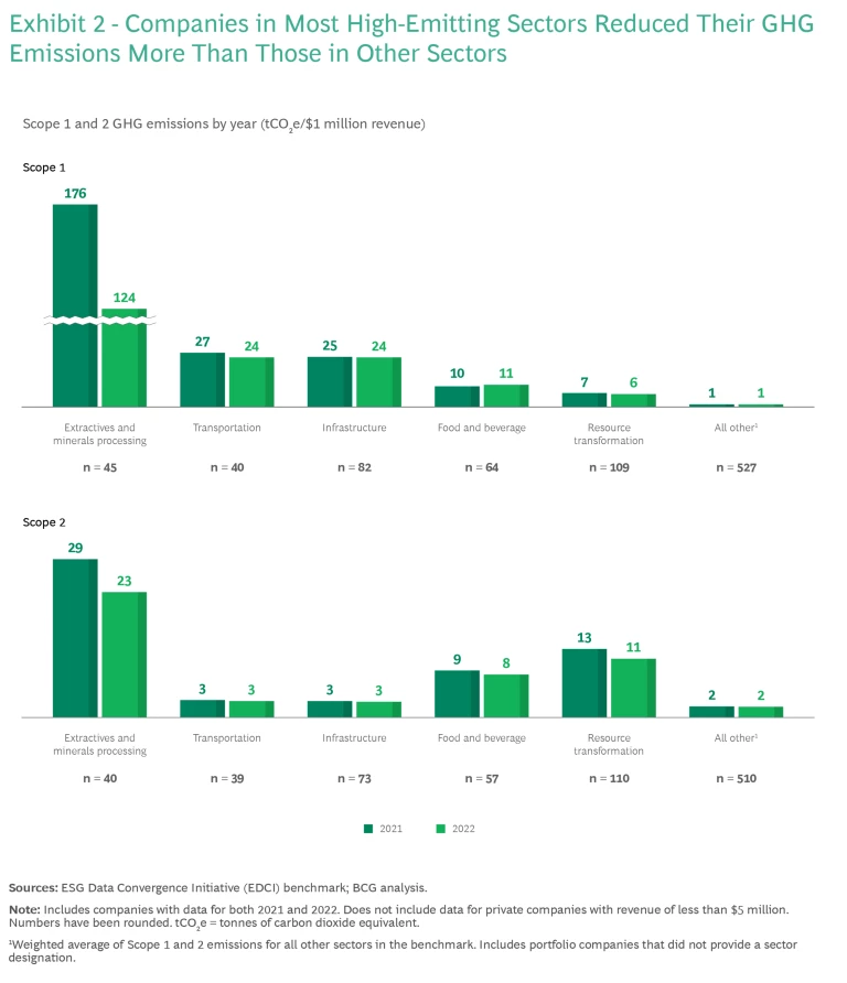 Many EDCI portfolio companies have been collecting consistent emissions data since 2021, and this allows us to understand how emissions have been evolving in different sectors. Overall, the picture is mixed, with some sectors seeing drops in emissions intensity and others seeing slight increases. In general, the high-emitting sectors—notably, E&M and resource transformation—have seen larger reductions than the lower-emitting sectors, likely reflecting their greater urgency in cutting emissions. Of the five highest-emitting sectors, four (E&M, transportation, infrastructure, and resource transformation) saw decreases across Scope 1 and 2 emissions intensity, while Scope 1 emissions intensity rose at companies in the food and beverage sector. (See Exhibit 2.)