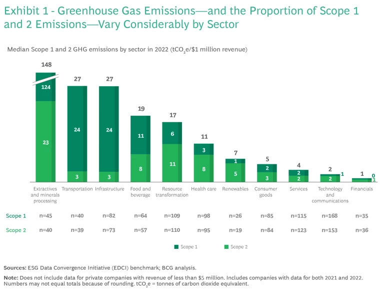 Emissions levels at private companies differ significantly by sector. Scope 1 and 2 emissions intensity, combined, ranges from an average of 148 tons per $1 million in revenue for private extractives and mineral processing (E&M) businesses down to 1 ton per $1 million for financial firms. (See Exhibit 1.)