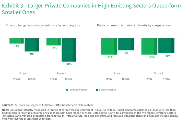 The picture changes when looking at companies by size. Decarbonization rates are relatively consistent across both larger and smaller public companies in the highest-emitting sectors. But for those same sectors, larger private companies (those with revenue of $200 million or more) have been reducing their carbon footprint across both Scope 1 and Scope 2 emissions significantly faster than smaller private companies. At the same time, larger private companies have been decarbonizing more quickly than their public peers, while smaller private companies have been lagging. (See Exhibit 3.)