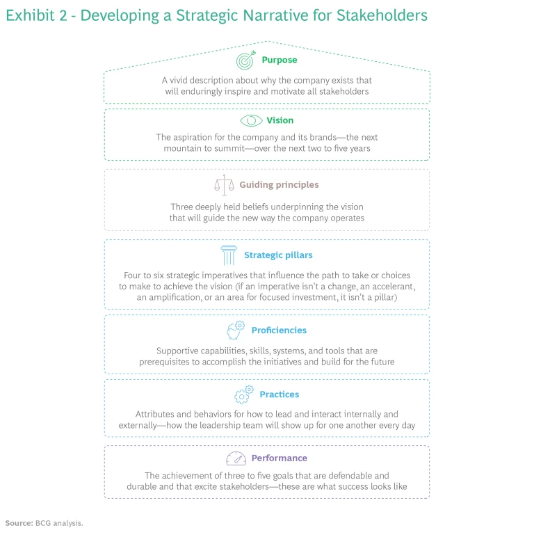 A Strategic Narrative and Ambition. CEOs need a clear narrative to tell investors, employees, and other stakeholders about where the company is headed, how it intends to get there, and what a great company and great stock look like. (See Exhibit 2.) Their vision is tied to specific priorities, initiatives, and operational changes that will bring it to life. Equally important, CEOs need to be clear and get agreement on the paths that the company will not take. Their vision is perhaps their most visible stamp on the organization, at least in the first half of their tenure.