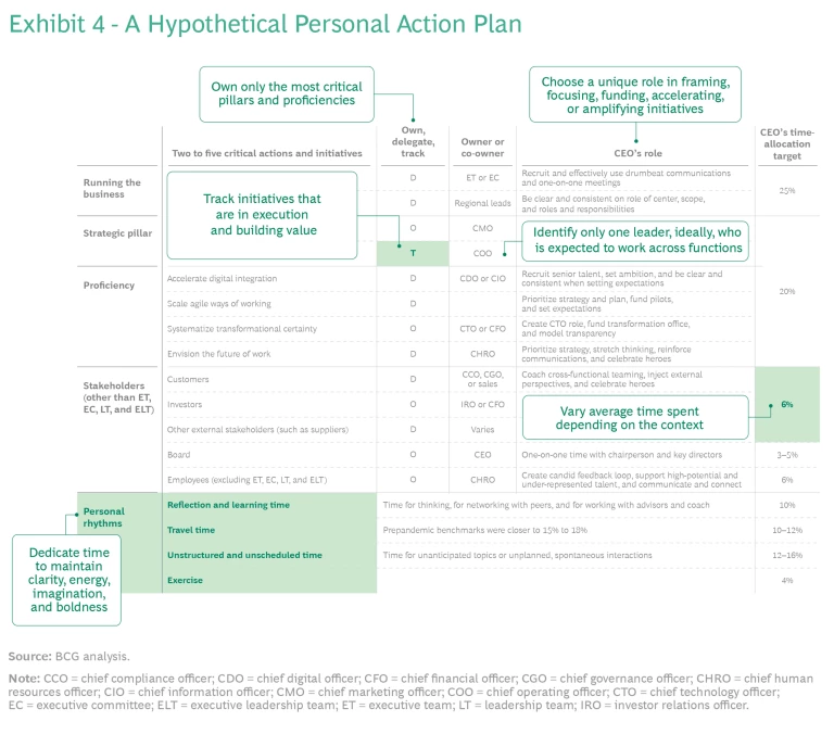 Prepare a personal action plan. This plan links the priorities identified in the 100-day plan to those that the CEO wants to focus on over the first 12 months. (See Exhibit 4.) For each strategy and priority, CEOs reflect on the amount of time to allocate as well as the unique role to play: own, delegate, or track. They can then think through the best way to use their authority.
