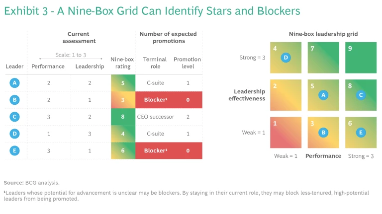 Evaluate the top 25 to 50 leaders. This exercise complements the talent and organizational readiness assessment described earlier. A CEO assesses each senior leader on two dimensions—current performance and leadership effectiveness—using a nine-box grid. This exercise forces executives into one of the nine boxes and generates a rating for each of them. (See Exhibit 3.) The CEO also assesses how many more promotions are likely over the course of each employee’s career. The exercise helps new CEOs identify their stars—and blockers. The upper reaches of many organizations have solid executives who have reached their potential. These blockers often occupy positions that otherwise could be filled by rising stars. It also helps CEOs identify which executives to help grow by giving them high-profile assignments or by suggesting that they work with a coach, mentor, or sponsor.