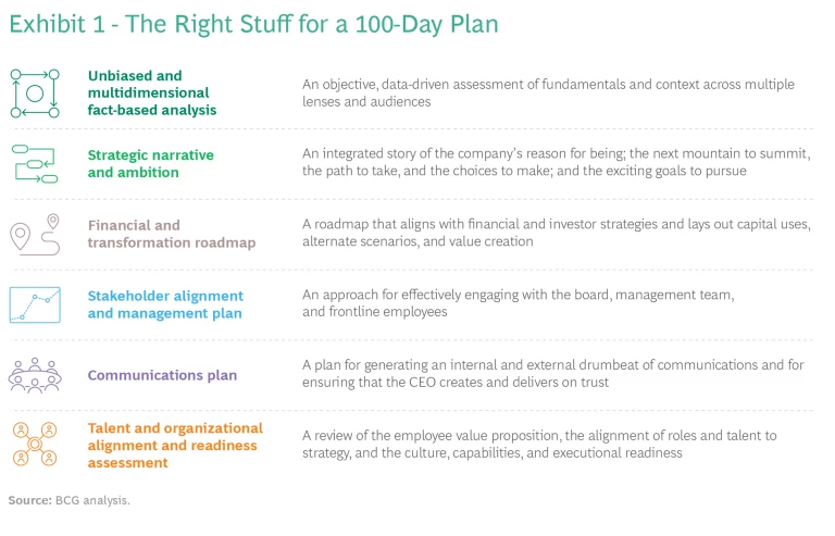 The first 100 days concept can be useful at any inflection point for the business. A sharp decline in the share price, a sudden vulnerability to activist investors, or a recapitalization (such as a private-equity deal) are all opportunities for the CEO to step back and reset. The exercise applies equally well when business units or functions are in need of fresh thinking.