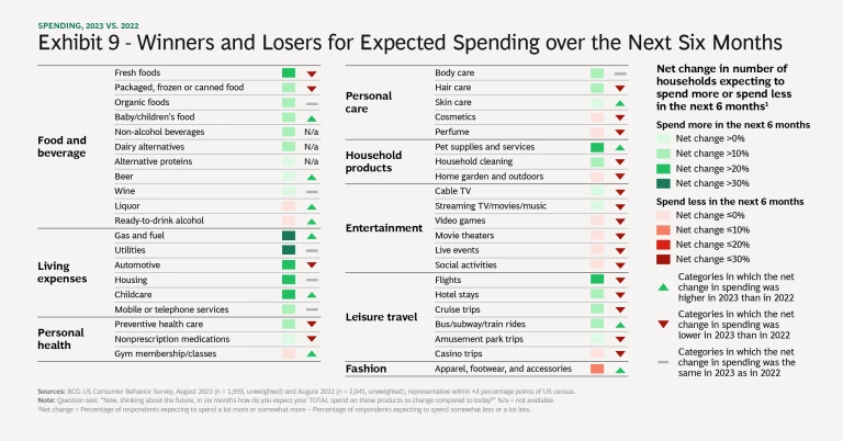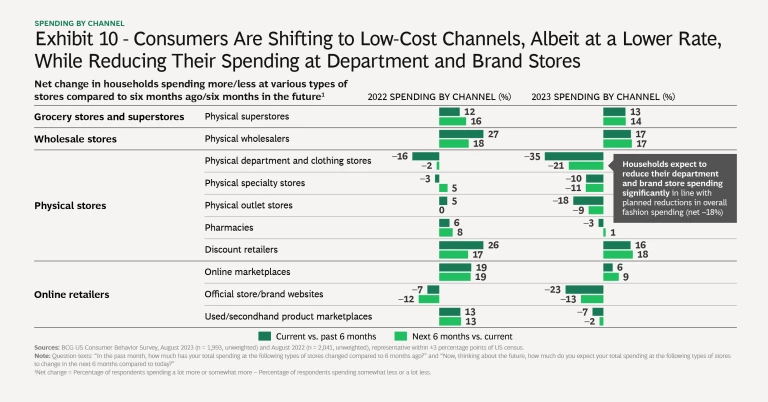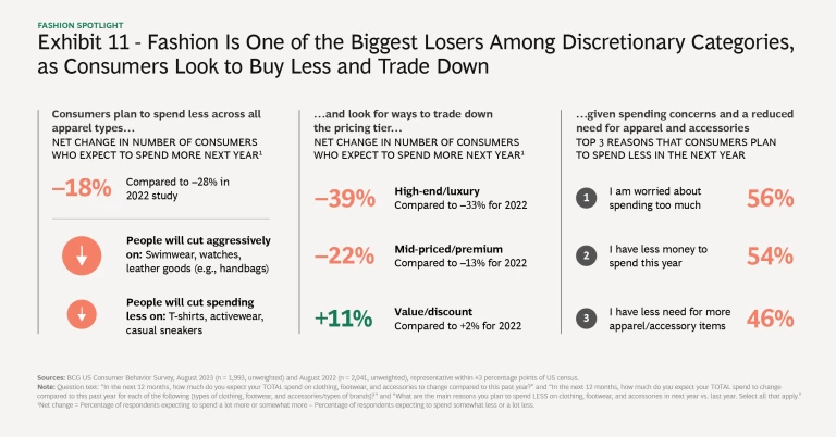 We also see more evidence of deal hunting, with consumers saying that they plan to decrease their spending at department stores and branded stores, instead shifting to low-cost channels such as discount retailers, online marketplaces, and wholesalers. (See Exhibit 10.) One of the hardest hit categories is fashion, where we see consumers looking to spend less and to trade down in light of spending concerns, a belief they will have less money this year, and a reduced need for apparel. (See Exhibit 11.)
