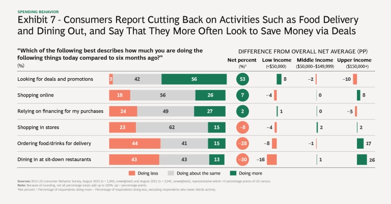 Like a good imitation, most consumer behaviors match what we would see in an actual recession, continuing the trends that we saw in our August 2022 survey. Consumers are spending less in such categories as clothing, food delivery, dining in restaurants, and out-of-home entertainment (for example, movies and live events). (See Exhibits 7, 8, and 9.)