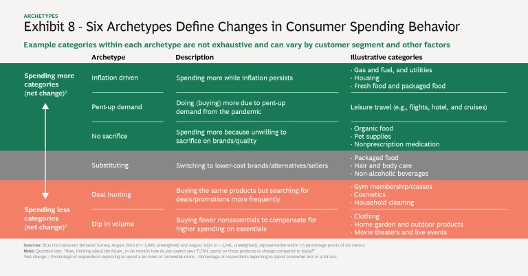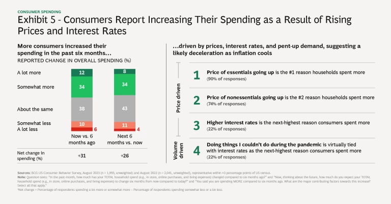 The areas where spending is increasing are also those we would expect to observe in an actual recession. Consumers are increasing spending on essentials such as gas, food, and utilities, and they cite inflation as the primary driver. Consumers also continue to isolate a small set of “no sacrifice” categories in which they will not decrease spending despite harder economic times; these include organic food, nonprescription medication, pet supplies and services, and health food (for example, dairy and protein substitutes).