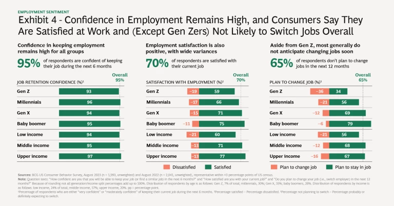 On the other hand, if you look at the typical indicators of a recession, only one of those common indicators—a higher Federal Funds rate— is clearly still in evidence today. (See Exhibit 3.) The US’s high rate of inflation in 2022 (8% on average) has cooled in 2023 from 6.4% in January to 4.9% in April to 3.7% in September. Moreover, the country has not experienced negative quarterly GDP growth, and unemployment continues to be low (3.8% in August). In fact, consumer confidence in employment is exceptionally high, with 95% of consumers confident that they will be able to keep their job or find a new one in the next six months. (See Exhibit 4.) Employment satisfaction is also strong, at 70% overall.