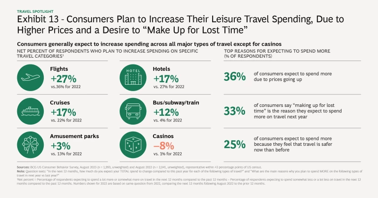 On the other hand, leisure travel is a discretionary category that usually faces declines when the economy softens—and yet in today’s economic environment we see a net increase in consumers who plan to spend more on travel in the next 12 months. (See Exhibit 13.) We observed this pent-up demand in our August 2022 survey, and we continue to see it today. In fact, in the travel subcategories of flights, hotels, cruises, amusement parks, and business/trains/subways, more consumers in our survey said that they will spend more in the next 12 months than said that they will spend less. Consumers cite rising prices due to inflation as one reason why they are spending more on travel (36%), but they also note that they are continuing to make up for lost time (33%), spending on things they couldn’t do during the COVID-19 pandemic.
