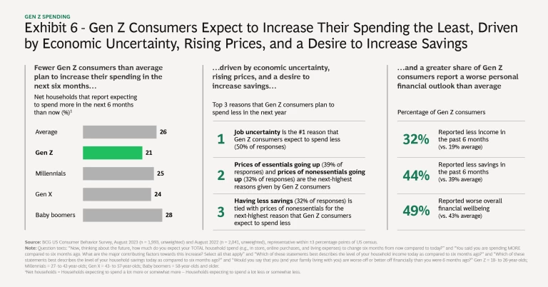 So, why are consumers feeling financially squeezed? In our survey, 46% of consumers said that they increased their overall spending during the previous six months, primarily in response to rising prices due to inflation. (See Exhibit 5.) Further, 90% of consumers noted that this was due to price increases of essential purchases, while 74% claim that it was due to price increases on nonessentials. A smaller percentage of survey respondents (22%) also blamed rising interest rates for driving up spending. Unsurprisingly, the youngest generation surveyed—Gen Z—reported facing a worse financial outlook than other generations did. They also said that they expect to increase their spending the least, driven by economic uncertainty, rising prices, and a desire to increase savings. (See Exhibit 6.)
