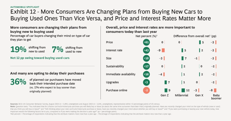 In automotive, more consumers are switching plans from buying a new car to buying a used one than vice versa. (See Exhibit 12.) We also see more consumers planning to delay their intended automotive purchase date (36%) than planning to move it forward (17%). And when asked what factors are most important in purchasing or leasing a car today compared to a year ago, more consumers note price (61%) and interest rate (43%) than any other attribute. Size is the third-most mentioned attribute, although just 18% of consumers cite it.