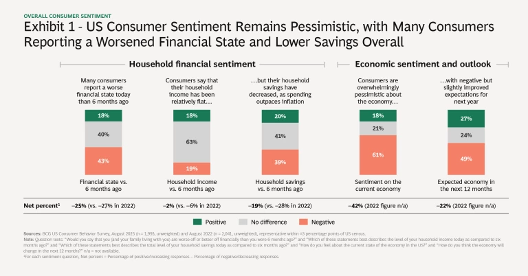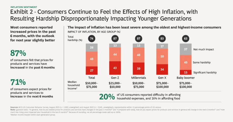 That's what we are seeing in the US economy. Although it has continued to elude falling into actual recession, many consumers feel that the economic situation is grim. In our most recent survey of US consumer sentiment, conducted in August 2023, 61% of consumers expressed pessimism about the economy today, and 49% remain pessimistic as they look ahead to the economic situation 12 months from now. (See Exhibit 1.) When asked about their personal financial position, 43% report that they are in a worse financial state now than six months ago. And the current inflationary environment has an even more far-reaching impact, as 74% of consumers say that they are experiencing some hardship or significant hardship due to inflation. That number is even higher for Gen Z and Millennials (87% each) and for Gen X (83%). (See Exhibit 2.)