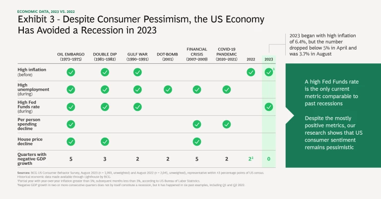 If you ask consumers today about the knockoff recession we’re having, they will tell you that it’s a very good fake. In fact, 49% of the consumers we surveyed believe that we are currently in a recession, and 66% are worried that the world will struggle with a long-term economic recession. Aside from feeling pessimistic, many consumers are behaving as if we are in the midst of a genuine recession—cutting back on spending in key categories, shifting spending to lower-cost channels, deal hunting, and spending more in essential categories as a way of coping with inflation. But because the economy is hanging on and employment numbers continue to be strong, this knockoff has so far cost consumers, and the US economy as a whole, a lot less than the real thing—just as any good imitation should. The big question is, will that state of affairs last?