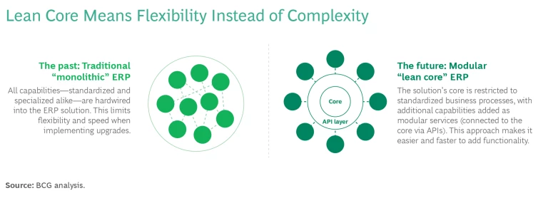 And crucially, lean core allows companies to innovate and differentiate at speed. Take, for instance, supply chain optimization. An algorithm for demand-supply optimization can be an important differentiation feature. But if it’s left within your ERP core, it can’t be easily changed. By implementing this feature outside the core, you can make enhancements more quickly, and with fewer constraints, so you can ensure that your optimization is always optimal.
