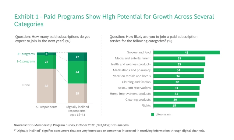 Paying for Rewards. Membership programs continue to increase in scale and impact, enabled by businesses’ growing data and analytical capabilities. Ample opportunities still exist for companies to launch new paid membership programs or introduce paid options to their current programs, especially in industries where customers have expressed an interest. (See Exhibit 1.) Even beyond those industries, however, we expect to see more programs generating meaningful results in terms of loyalty and engagement that boost top-line growth. Such programs are even being offered today in industries not traditionally known for membership programs, such as restaurants and automotive brands.