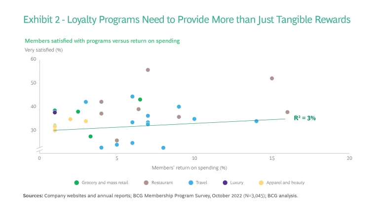 Perhaps surprisingly, the perceived value of a loyalty program is not necessarily monetary. Whether a program is fee-based or free, customers want more than financial rewards. In fact, our survey finds a low correlation between members’ return on spending and their satisfaction with the program. (See Exhibit 2.)