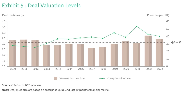 ESG. BCG’s 2022 M&A Report delved into the role of ESG in M&A, with a particular emphasis on “green dealmaking." The share of deals related to ESG in general and to environmental considerations more specifically has grown steadily over the past two decades. (See Exhibit 9.) This trend will continue to drive M&A as companies try to acquire capabilities and assets that address decarbonization, the energy transition, clean tech, and the circular economy.