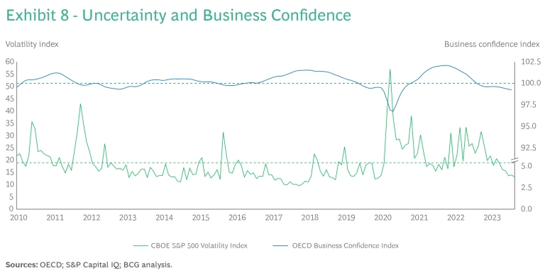 Converging Price Expectations. Disparities between sellers' and buyers' pricing expectations have impeded dealmaking during the past year, especially in light of the abrupt and rapid changes that have occurred in the market environment. However, many factors that influence prices—such as valuation levels, financing costs (that is, interest rates), and uncertainty—appear to be stabilizing. (See Exhibits 5 through 8.) As a result, we expect the gap between sellers’ and buyers’ expectations to continue to narrow over the next few months.