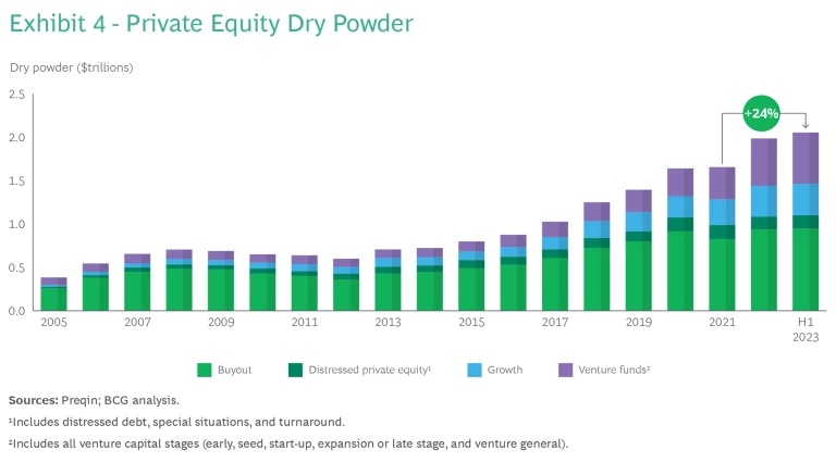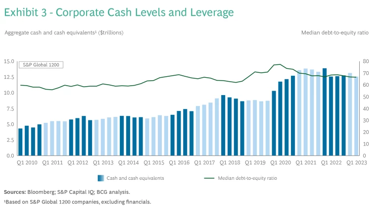 Abundant Dry Powder. Although capital has become more expensive, abundant capital remains available from sovereign wealth funds, PE and VC investors, and some large companies—including technology titans and companies backed by sovereign wealth funds—that are flush with cash and boast strong balance sheets. These factors will bolster dealmaking in the near term. (See Exhibits 3 and 4.) For example, the cash-rich Abu Dhabi National Oil Company has made an offer to acquire German chemicals company Covestro.