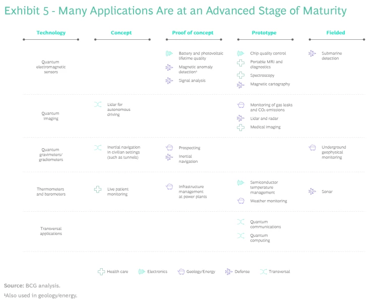 Prototypes for many applications in these industries are emerging. Defense and medical applications appear to be the closest to market maturity, but there are strong advantages for quantum sensors in electronics and geology and energy as well. (See Exhibit 5.)