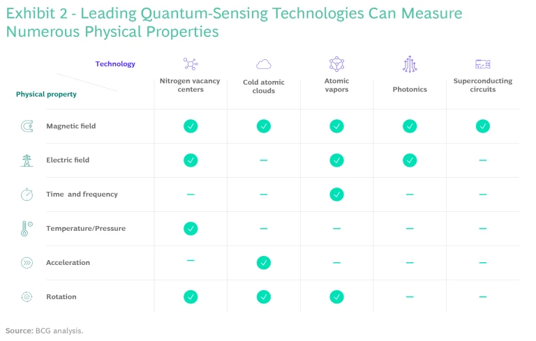Second, the extreme sensitivity of quantum sensors will deliver greater precision in various types of measurement, such as time, frequency, acceleration, temperature, pressure, rotation, and magnetic and electric fields. (See Exhibit 2.) This could have a transformative impact in many areas, including defense and aerospace, health care, electronics, and geology and energy. Several applications involving quantum sensing (such as lidar) may have an impact on mass-market products, such as automobiles, in the medium to long term. Niche use cases are already being addressed, and more will soon be commercial realities—perhaps in the next three to five years for the most mature.
