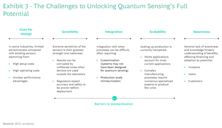 Integrating quantum sensing with other processes can be difficult because additional miniaturization and customization may be needed. Scaling up sensor production is currently hampered by the mostly niche applications now in use and by complex manufacturing processes that require numerous specialized experts to produce relatively few units. Finally, a general lack of awareness and knowledge hinders understanding of the benefits of quantum sensing, which affects both financing and adoption.