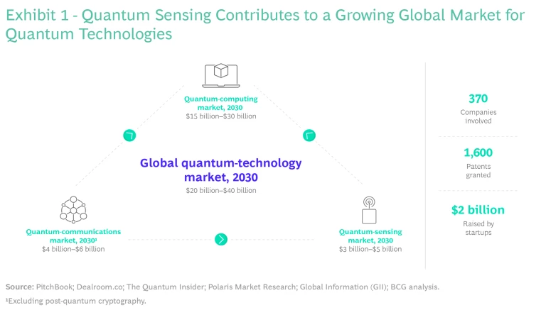 We recently observed that for large companies, enterprise-grade quantum computing is coming into view. We also expect new uses for quantum-sensing technology to emerge in the next decade, potentially with disruptive effect. Some 1,600 patents already have been granted, and startups raised $2 billion in 2022. The total attainable market for sensors is projected to reach $170 billion to $200 billion by 2030 and we expect the global quantum-sensing market to reach $3 billion to $5 billion by 2030 (or a 2% to 3% share of the wider sensor market), which will help propel the global market for all quantum technologies to $20 billion to $40 billion. (See Exhibit 1.)