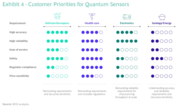 Three other sectors in addition to defense stand to benefit, each with its own priorities. (See Exhibit 4.) Medical and pharma users have demanding requirements in multiple areas, such as sensitivity and size, because of mission-critical functions, safety criteria, and regulation. Electronics manufacturers value great accuracy and reliability and the ability to perform at scale (think of the millions of chips manufactured every year). Users in geology and energy have low price sensitivity and may be the least demanding in terms of performance; safety requirements are their top concern.