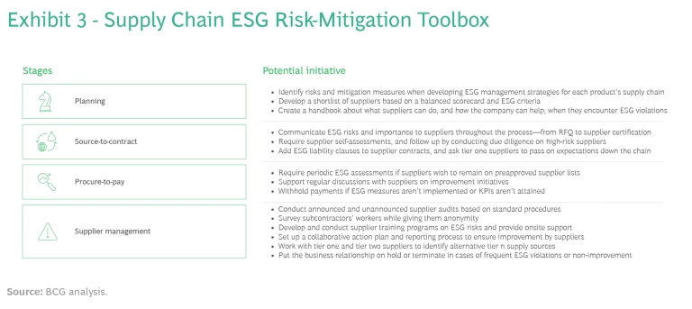Develop Risk-Specific Measures. It’s important to interact closely with suppliers on risk identification and incident management. Developing a standardized, company-specific toolbox will help companies identify risks and mitigation measures along the procurement process. (See Exhibit 3.)
