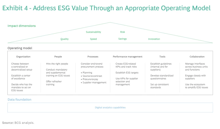 Then, the company should map out the cornerstones of an ESG-focused operating model. It must identify the best practices for the key elements—namely, organization structure, people, processes, performance management, tools, and collaboration—as well as the digital foundation (e.g., to monitor ESG compliance and identify potential risks). (See Exhibit 4).