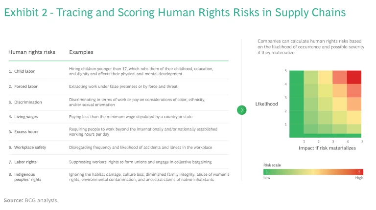 Calculate Risk Scores. Once companies understand their supply chains and material flows, they will be able to assess the ESG risks they face in their own facilities—such as factories, distribution centers, and warehouses—as well as the often larger risks present in the many levels of their supply chains. Each score they assign will be specific to the category and country in which it could occur, the nature of the risk, and the supply chain tier. These scores are essential to help companies better manage the likelihood of violations.