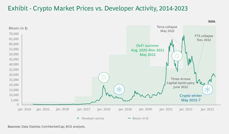 DeFi summer ended in November 2021. Later came the collapse of the stablecoin Terra in May 2022, followed in June by the bankruptcy of the Singapore-based hedge fund Three Arrows Capital. Then came further interest rate hikes from the Federal Reserve and the FTX bankruptcy. Each time, the risks became clearer, and more investors pulled back. By May 2022, the current crypto winter was fully underway, marked by a steep drop in values. (The term “crypto winter” makes reference to “Winter is coming,” the motto of one of the warring houses in the TV series Game of Thrones. The motto refers not only to the harshness of winters in the house’s continent but also to the inevitability of difficult times.)