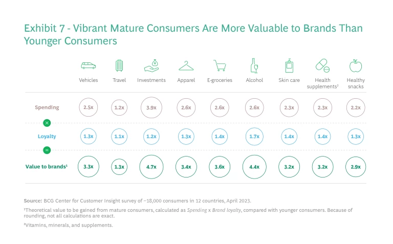 The value of vibrant mature consumers is especially great, thanks to their combination of high spending and high loyalty. We estimate that the average vibrant mature consumer is roughly three times as valuable to apparel, healthy snacks, health supplements, and skin care brands as the average young consumer, and more than four times as valuable to alcohol beverage and investment brands. (See Exhibit 7.)