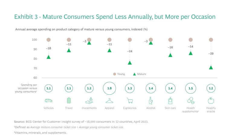 Global research conducted by BCG’s Center for Customer Insight on mature consumers clears up many of these myths. It also reveals that the return on investment (ROI) for marketing to mature consumers is far better than often assumed. Mature consumers have immense buying power, spend more than members of other age groups do on individual purchases, exhibit strong brand loyalty, are resilient through economic ups and downs, and wield surprising influence over younger consumers.
