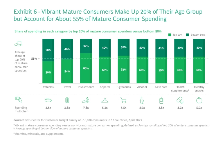 The commercial value of vibrant mature consumers is substantial: although they make up only 20% of all mature consumers, they account for a disproportionately large share of spending among their age group in every category we studied—ranging from 50% of spending on vehicles to 68% of spending on investment products. (See Exhibit 6.)