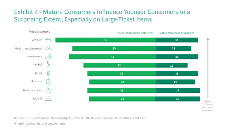 Brands also vastly underestimate the influence that mature consumers have on other groups of consumers. In fact, mature consumers are significantly more likely to influence younger consumers than the other way around. (See Exhibit 4.) In all of the categories that we researched, mature consumers project a “halo effect” on brands they choose—especially with respect to big-ticket purchases, such as investment products, vehicles, and leisure travel. In these product categories, many young consumers seek to tap the experience of their elders to reduce risks or receive validation for their choices.
