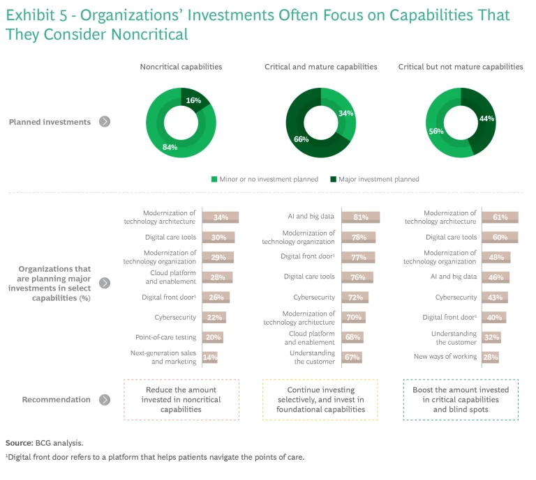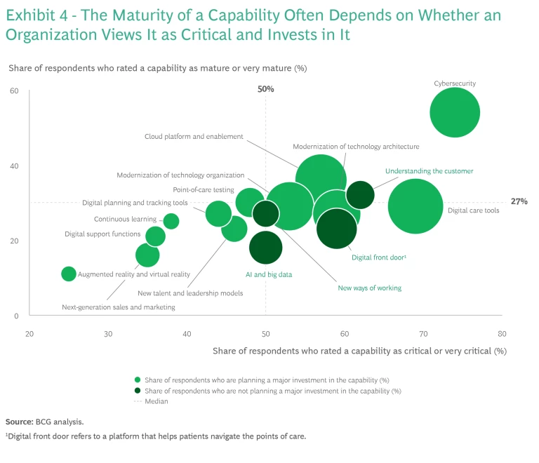 However, more than 60% of digital and technology leaders surveyed do not think that their organization is mature in critical capabilities. Within this group, less than roughly 45% of respondents said that their organization is planning major investments in AI and big data, new ways of working, a digital front door (a platform that helps patients navigate the points of care), and understanding the customer.