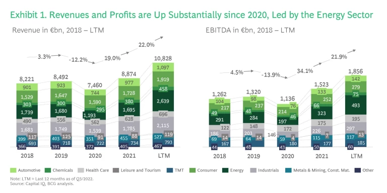 Yet the situation on the business front is not as bleak as this data may imply. While company revenues and profits dipped considerably during the pandemic, they have mostly recovered to well above pre-pandemic levels in the following years. And they continued to grow through the third quarter of 2022 across almost every industry—although the growth rate has slowed somewhat more recently (see Exhibit 1). Equity ratios are currently above historical levels, and cash accounts grew significantly during the pandemic, supported by government programs and company efforts to conserve cash and reduce costs. Taken together, our analysis shows that the number of companies in crisis based on their financial status has declined since 2021.