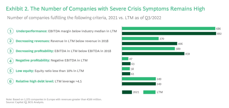 As a result, 12% of the companies studied exhibited three or more crisis symptoms in the 12 months through the third quarter of 2022, such as lower revenues or lower profitability compared to 2018, and EBITDA margins below the industry median. That's down from 2021, when 18% of companies exhibited such symptoms, but still disturbingly high. Of particular concern is the high number of companies that are underperforming compared to their industry median, and those with low equity ratios and high leverage. (See Exhibit 2.)