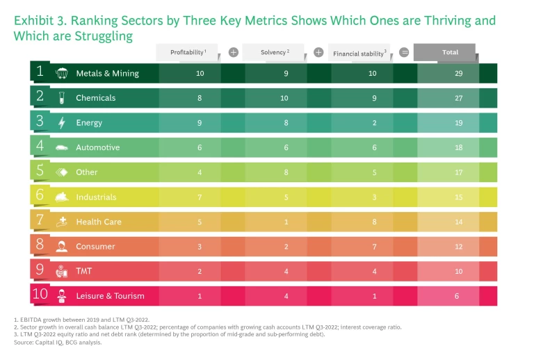To understand in greater detail the challenges European companies are facing, we ranked nine key sectors by three vital financial metrics: profitability; solvency and financial stability (see Exhibit 3). (The analysis does not include Financial Services because the sectors’ key performance metrics are not comparable to those in non-financial sectors.) The results make clear which sectors have been more successful than others in overcoming the past challenges facing businesses throughout Europe. And they suggest how well prepared they are to prosper in future.