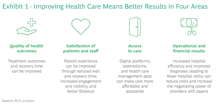 We interviewed senior executives at major hospitals across Europe and the Middle East. They are clear-eyed on the need for digital transformation, but they also have big concerns about the extent and difficulty of the challenge. Success means improving the quality of health outcomes, the satisfaction of patients and staff, access to care, and the hospital’s own operational and financial results. (See Exhibit 1.)