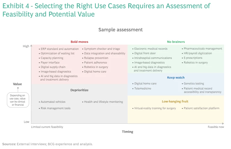 Selecting the right use cases requires assessing the feasibility and potential value of each one. (See Exhibit 4.) This analysis should segment the candidates into higher- and lower-value initiatives and those that are relatively easy to implement and those that are more ambitious. While the actual implementation plan will depend on each provider’s strategic priorities and the results it wants to achieve, the assessment results in a clear roadmap that maximizes impact and limits complexity.