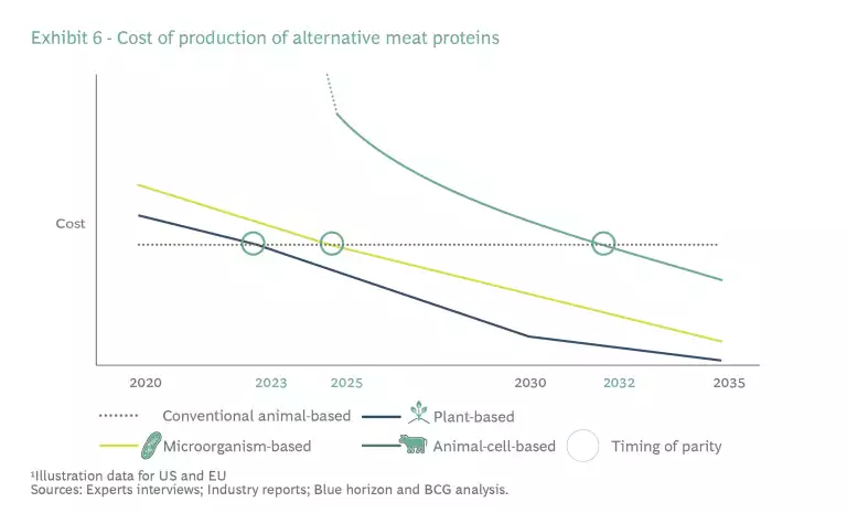 Rise in alternative proteins and alternative milk. Alternative proteins are a potential challenge to the meat and dairy industry given their environmental and animal welfare outcomes. Exhibit 6 outlines that alternative meat protein consumption is expected to grow at 15% per year to 2035 as the cost decreases,