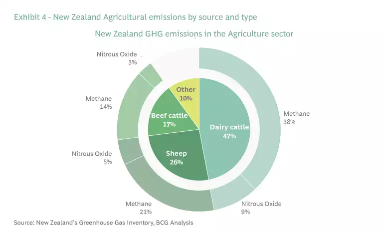 However, agriculture also contributes 48% of New Zealand’s gross greenhouse emissions, dominated by the production of animal products from dairy, sheep, and beef, as outlined in exhibit 4.