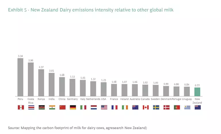 The opportunity is even larger, as New Zealand is well- positioned to lead the sustainable agriculture and food sector globally. Already, New Zealand's agricultural products are some of the lowest carbon and most environmentally friendly in the world. For example, the carbon footprint per unit of milk production in New Zealand is the lowest in the world and roughly half the global average, as outlined in exhibit 5.