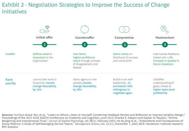 Step 1: The Initial Offer. Negotiation strategy teaches us that we need to state our intentions up front, so that both parties have a clear understanding of the “what.” But leaders often fail at communicating, in straightforward terms, what the change is, why it’s important to the organization, and how employees will contribute. Simply saying, “Our company will be better off in the future” is not enough to inspire employees.