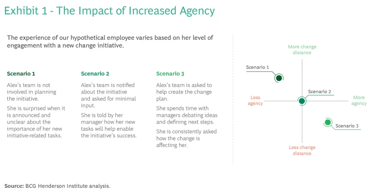 Change distance is a powerful force, and likely underlies many failed transformations. It is also logical: Change initiatives originate at the top, where CEOs brainstorm with their closest lieutenants, weigh options, create a roadmap, and give the green light for implementation. Because they are deeply engaged with decisions from the start, this group has less change distance. They’ve bought in. In contrast, a lower-level employee might only receive that companywide email where everything feels set in stone. Without agency, they experience more change distance—and their aversion starts to rise. (See Exhibit 1.)