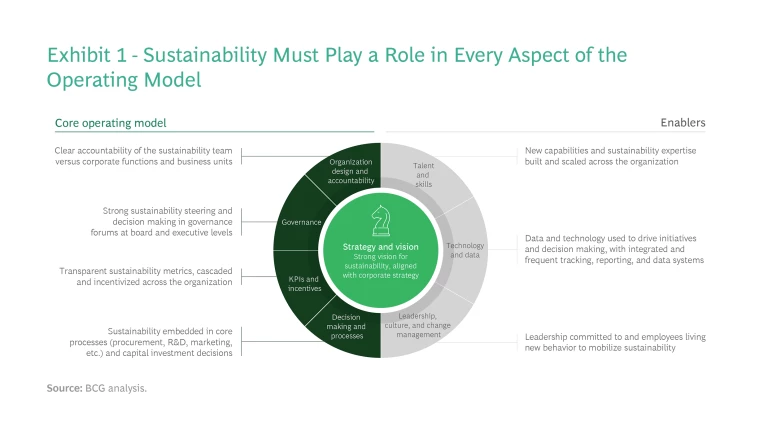 The first step in integrating sustainability into operations is to identify in detail the impact that the effort to achieve sustainability will have on a company's operating model. Exhibit 1 lays out the elements of a typical operating model, together with the required enablers, and indicates how and where sustainability should be incorporated. A corporate strategy informed by a vision for a sustainable future is central. Everything else—from decision-making processes and incentive structures to data collection and corporate culture—radiates from there. As the CSO of a global chemicals company put it, “I consider my job done when there is no longer the need for a large central sustainability team. Sustainability should be fully embedded in our company’s DNA, just like how we view profitability today.”